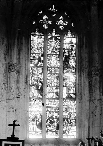POP | Plateforme ouverte du patrimoine3 verrières : Histoire d'Adam et Eve, vie de la Vierge, Dieu le Père, anges musiciens, Passion du Christ, pélican