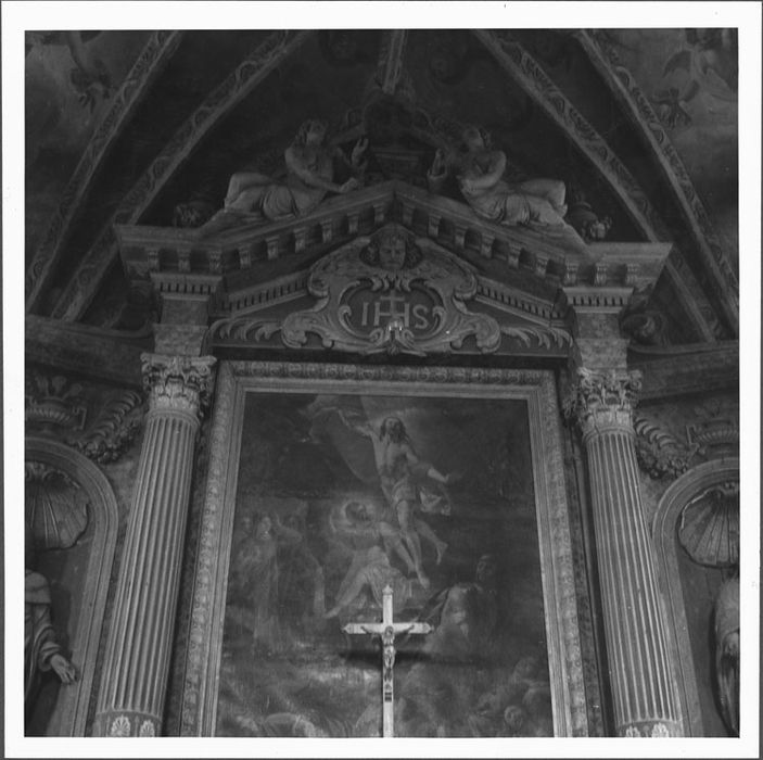 Maître-autel, le retable, sa toile : la Résurrection, son tabernacle, les statues de saint Louis, saint Martin, la Vierge et l'Ange d'Annonciation, bois peint et doré, première moitié du 17e siècle, 01-12-1960.