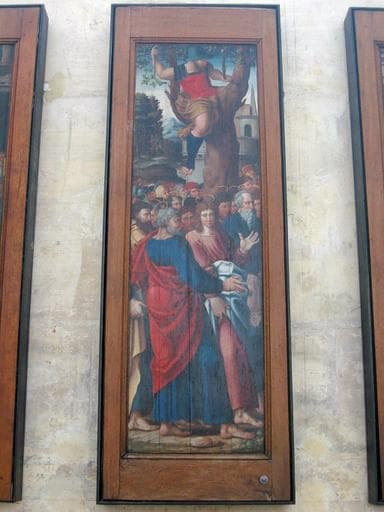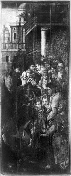Panneau peint : Entrée du Christ à Jérusalem, Naissance de la Vierge (grisaille)