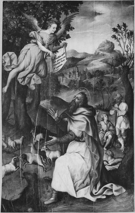 Panneau peint dit panneaux Fliche : Vision de saint Joachim, saint Jean-Baptiste (grisaille)