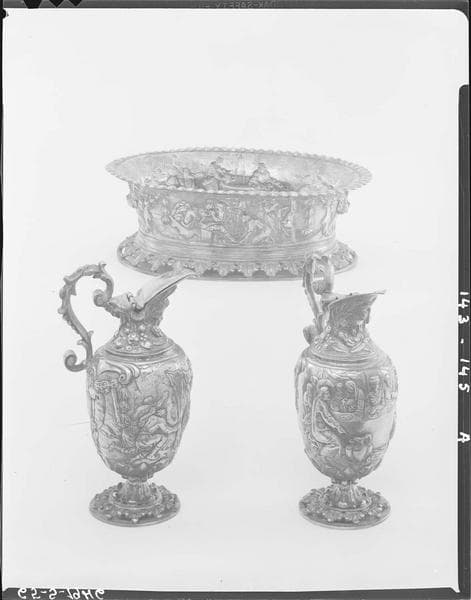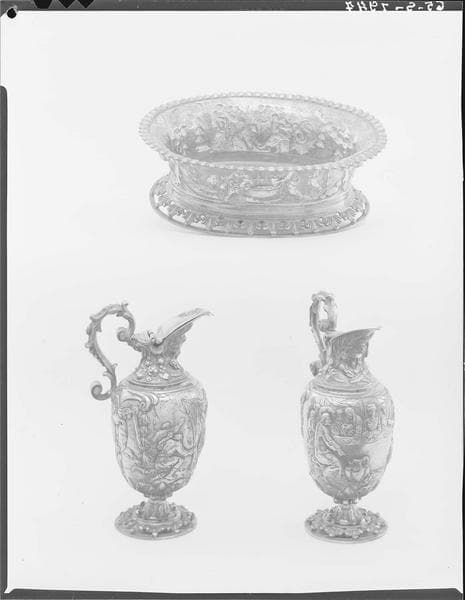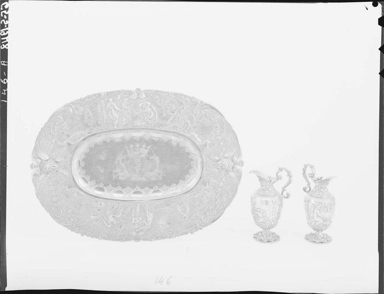 POP | Plateforme ouverte du patrimoine2 burettes et plateau à burettes aux armes d'Edouard Colbert : Moïse et l'eau du rocher, Noces de Cana, Jésus et la Samaritaine, Lavement des pieds