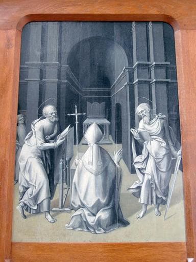Panneau peint (grisaille) : Scène de la vie de saint Rémy (le saint agenouillé entre saint Pierre et saint Paul)