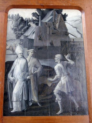 Ce panneau appartient aux volets d’un même retable que les autres scènes de la vie du saint PM10003355, PM10003356, PM10003358, PM 10002577 auxquels s’ajoutent trois panneaux conservés au musée d’Auxerre, formant le revers, et quatre panneaux formant l’avers, PM10003346, PM10003347, PM10003349, PM10003350. Agencement réalisé au 19e siècle par Valtat. Œuvre restaurée par Malesset en 1957.