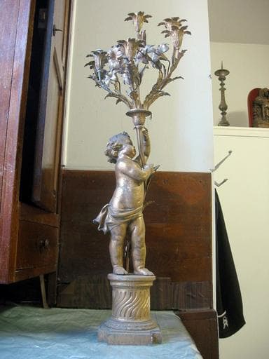 En 2 éléments : angelot sur socle en forme de colonne torse et chandelier composés de plusieurs bougeoirs.