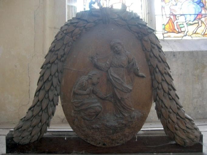 Médaillon sculpté cerné d'une guirlande. Placé au fronton du confessionnal.