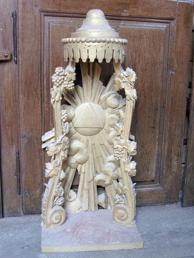 Manque la croix sommitale sur le dais. Partie arrière (gloire) a tendance à se détacher.