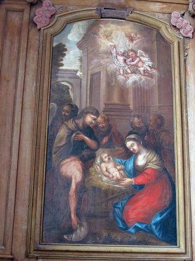 Retable de l'autel latéral Nord. Toile : La Nativité (provient de l'abbaye de Larrivour), bois sculpté et peint, XVIIIè s.
