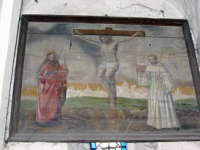 Panneau peint : Christ en croix entre saint Barthélemy et saint Bernard