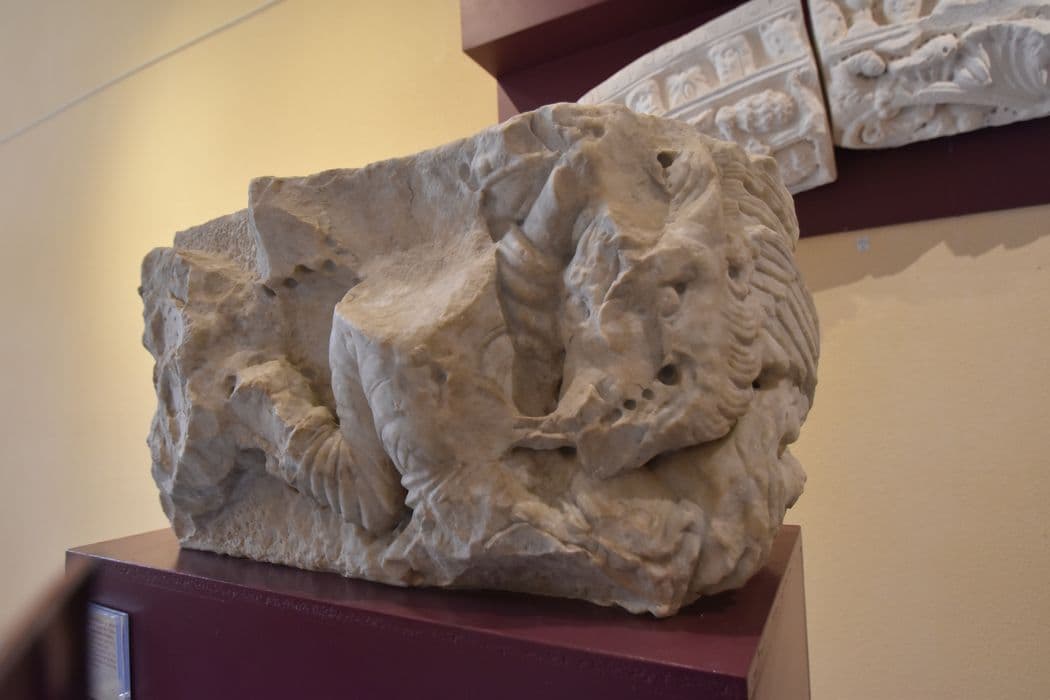 Ce fragment de sculpture représente la lutte d'un personnage dont on voit les bras avec un monstre ailé partiellement visible.
