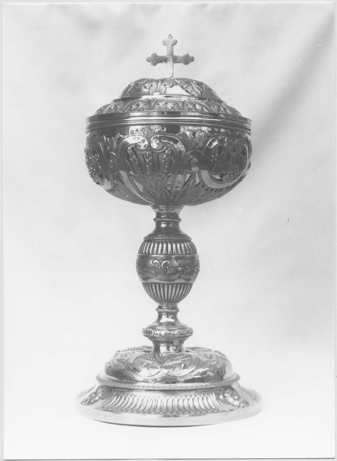 Le pied est rond. Au dessus d'une collerette se trouve le noeud ovoïde, entouré à mi-hauteur d'une bague. La fausse coupe est très découpée. La coupe est dorée. Le couvercle, en dôme, est surmonté d'une croix latine.