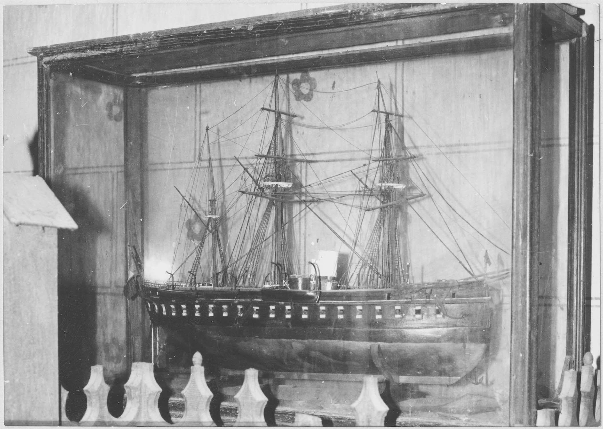 Maquette de frégate cuirassée à hélice 'Normandie' (brick à trois mats), armée de quarante pièces de canon. Elle est accompagnée d'une photographie jaunie d'un marin du nom de Joseph Vidal, assortie d'une notice explicative (Don du sieur Joseph Vidal, marin sur la frégate le Gomer, août 1866).