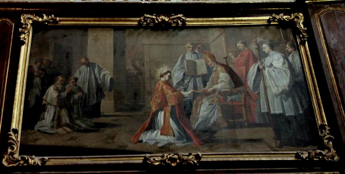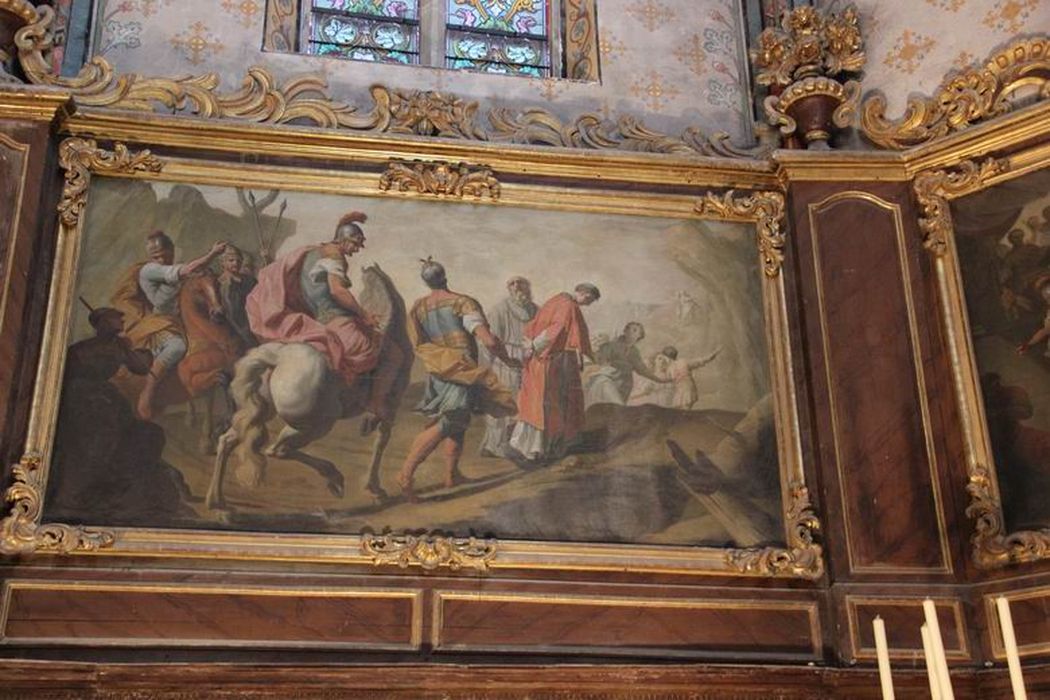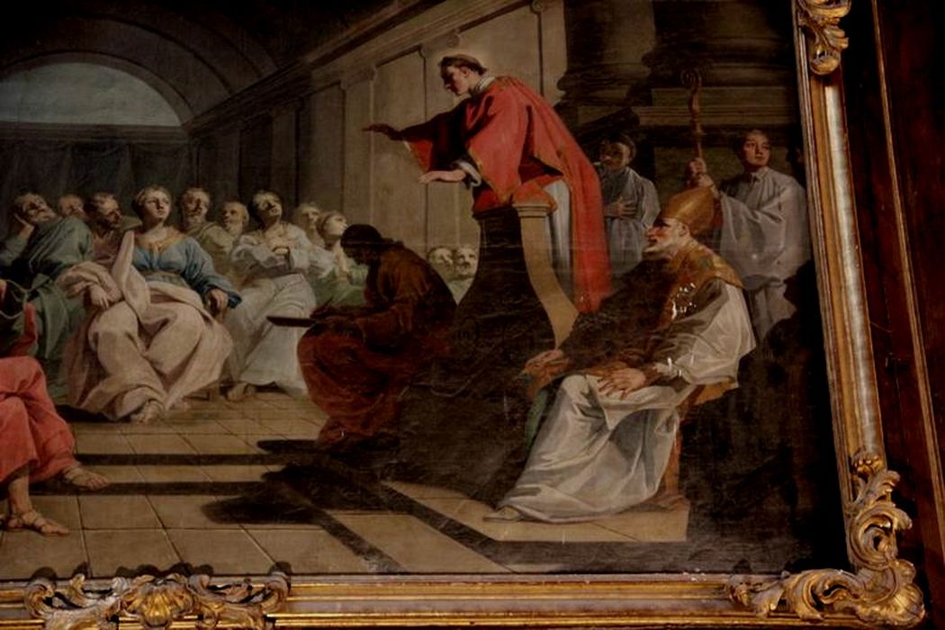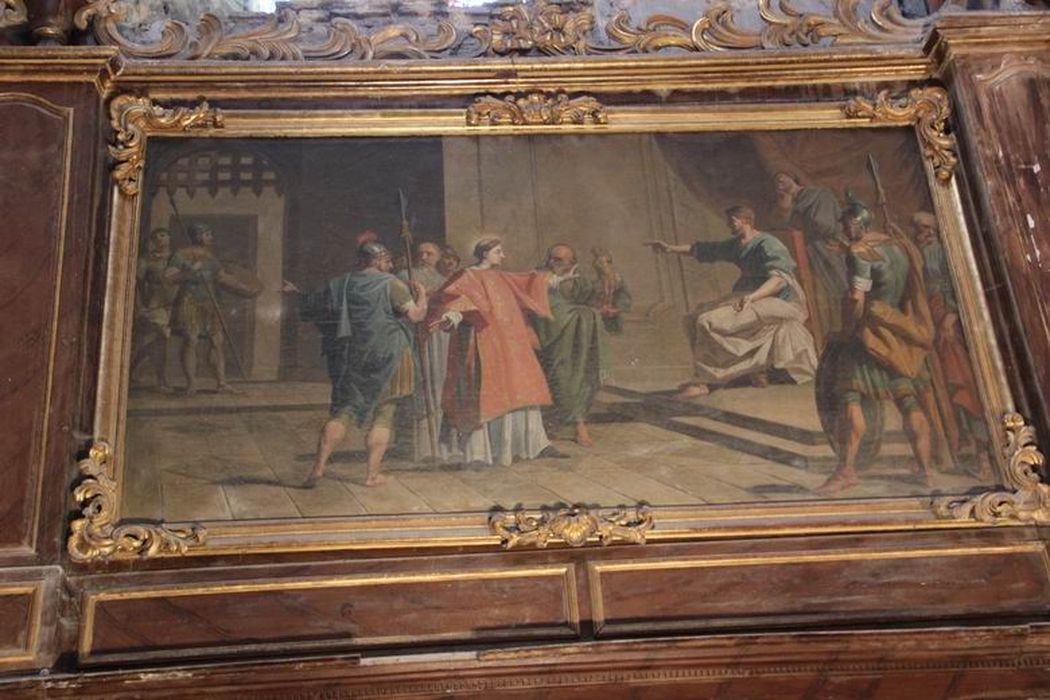 Les tableaux représentent l'Ordination de saint Vincent, la Prédication, l'Arrestation, le Jugement, le Martyre, le Saint sur un lit de roses, et l'Apothéose.
