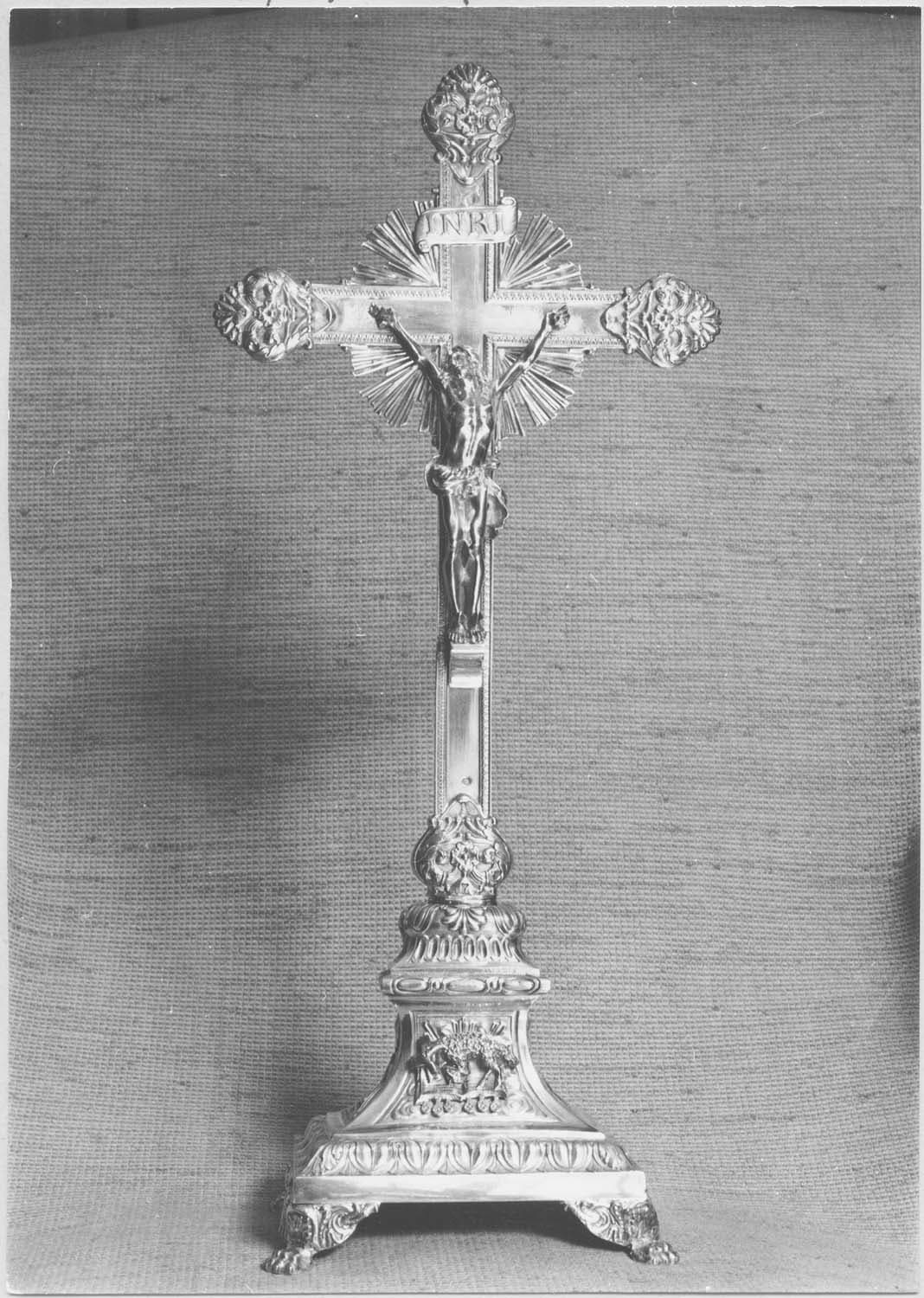 Cette croix d'autel est en argent en partie doré. Le pied rectangulaire repose sur quatre patins en griffe de lion.