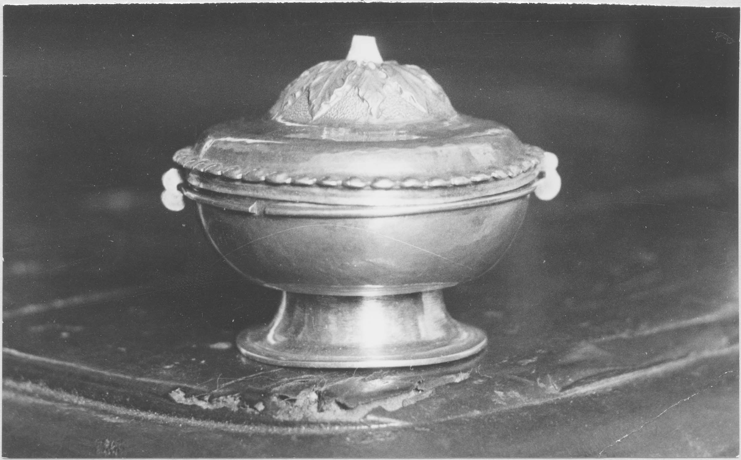 Elevé sur un pied à base circulaire, il ferme par un couvercle bombé, décoré de feuilles descendantes sur fond amati, autrefois surmonté d'une croix. Le couvercle est maintenu par deux clefs pénétrant dans une encoche sur un filet de la partie fixe. Argent martelé, uni et soudé.
