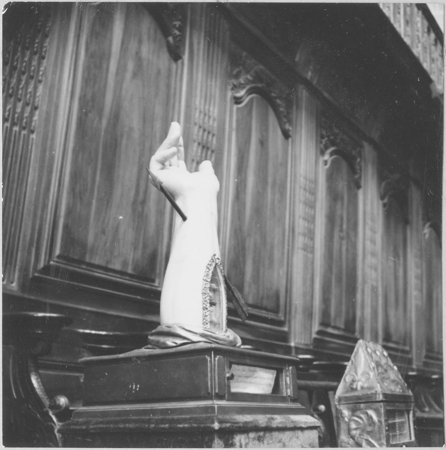 Le bras est percé de part en part d'une flèche. Une ouverture permet de voir, derrière une glace, la relique.