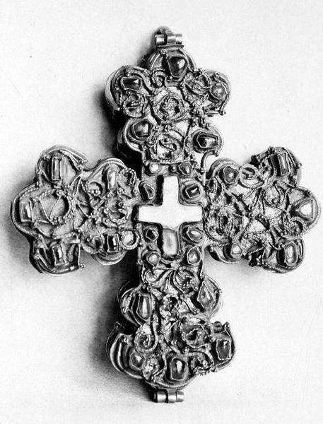 Croix pastorale ouvrante en argent doré décoré de filigranes et de cabochons. A l'intérieur, dix alvéoles contiennent des reliques.