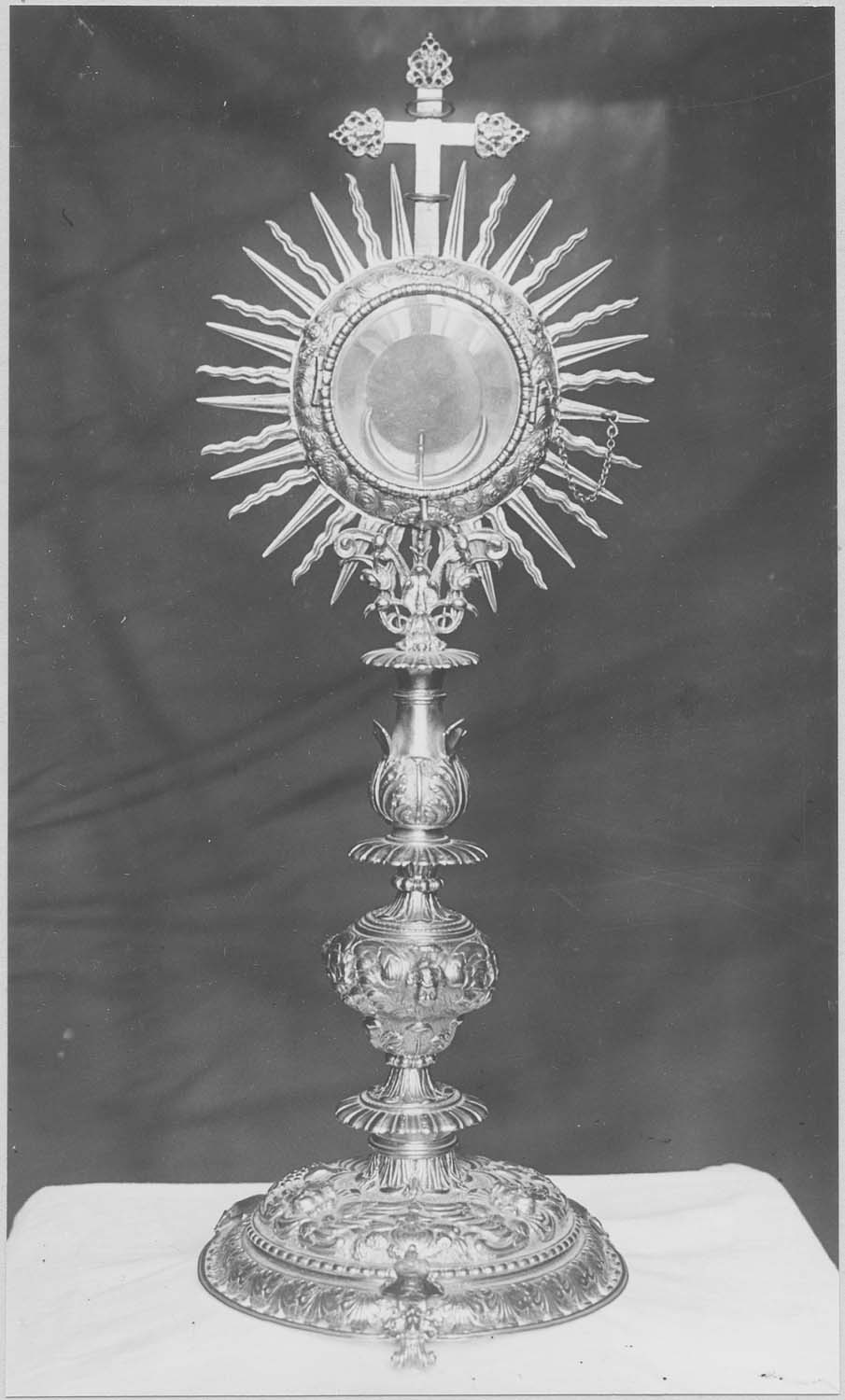 Le pied est circulaire, à trois griffes. La base est découpée à sa circonférence. La tige présente un noeud aplati à godrons, un second noeud en toupie, et un troisième noeud également aplati à godrons.