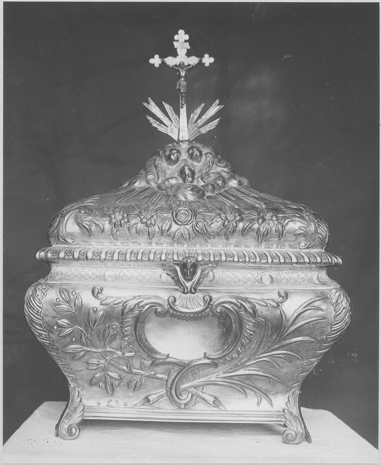 Cette châsse est en forme galbée. Elle repose par quatre patins sur une base rectangulaire. Le couvercle, bombé, est surmonté d'un crucifix.