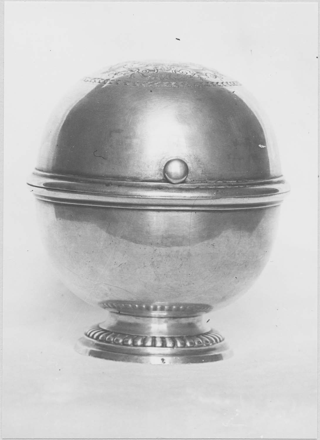 Chaufferette d'autel en forme de sphère sur piédouche à godrons. Elle ouvre sur son axe horizontal et contient à l'intérieur un cylindre métallique chauffant, isolé sur des griffes.