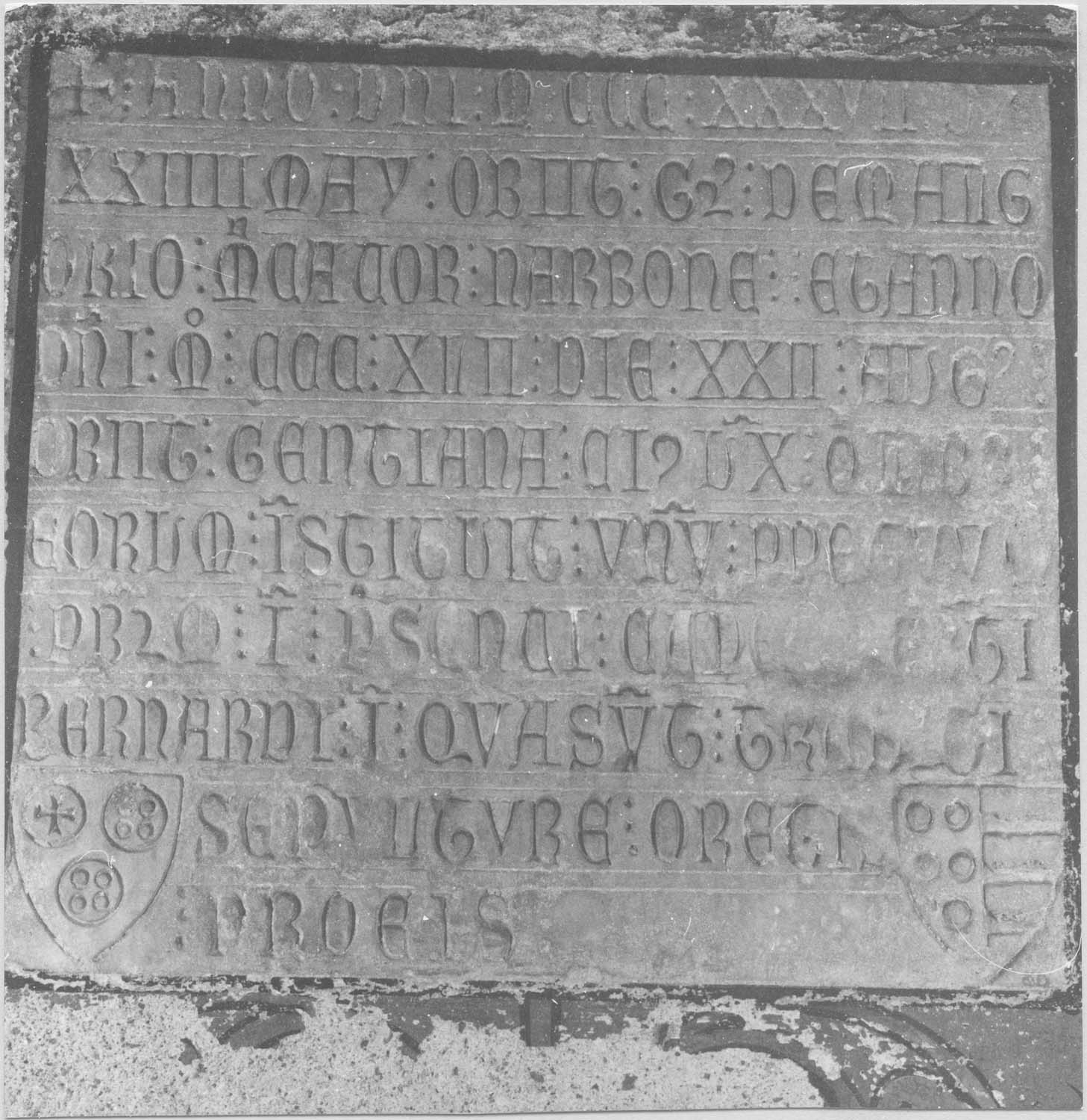 Inscription (gravée) : ANNO DNI M CCC XXXVII DIE XXIII MAY OBIIT G2 DEMANGORIO MCATOR NARBONE ET ANNO DNI M CCC XLII DIE XXII AUG OBIIT GENTIANA EISUX EORUM I[?]STITUIT UNU PPETUUM PBSM I PSENTI CAPELLA STI BERNARDI I QUASUT TRANSLATI SEPULTURE ORATE PRO EIS (dix lignes en caractères gothiques). Armoiries (gravées) : deux écus (dans les coins inférieurs).