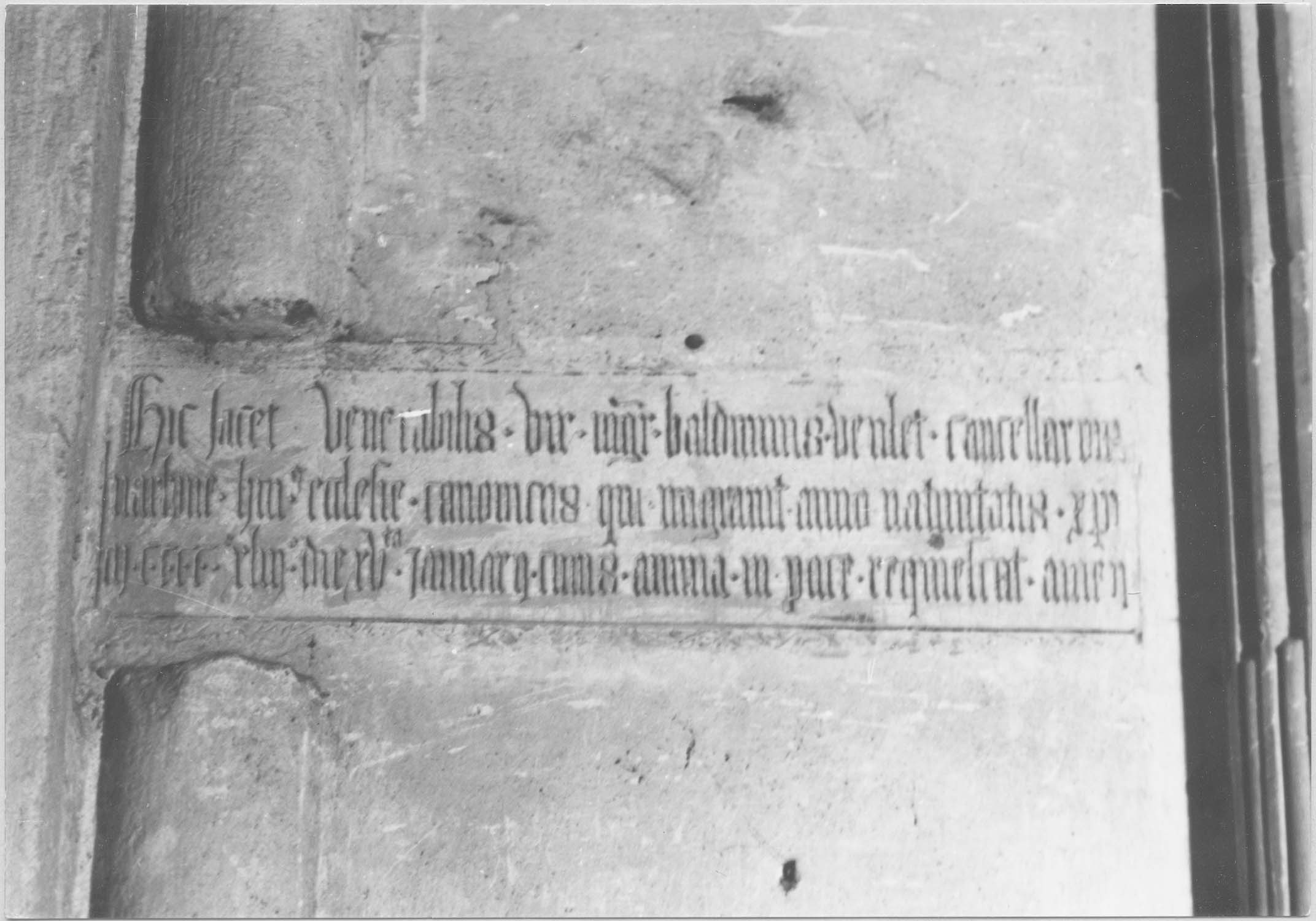 Epitaphe : HIC JACET VENERABILIS VIR M[a] G[iste] R BALDUINUS VEULET CANCELLARIUS NARBONE HUJUS ECCLESIE CANONICUS QUI MIGRAVIT ANNO NATIVITATIS XTI MCCCCXXVIII DIE XV IANUARII CUJUS ANIMA IN PACE REQUIESCAT AMEN (trois lignes en caractères gothiques).