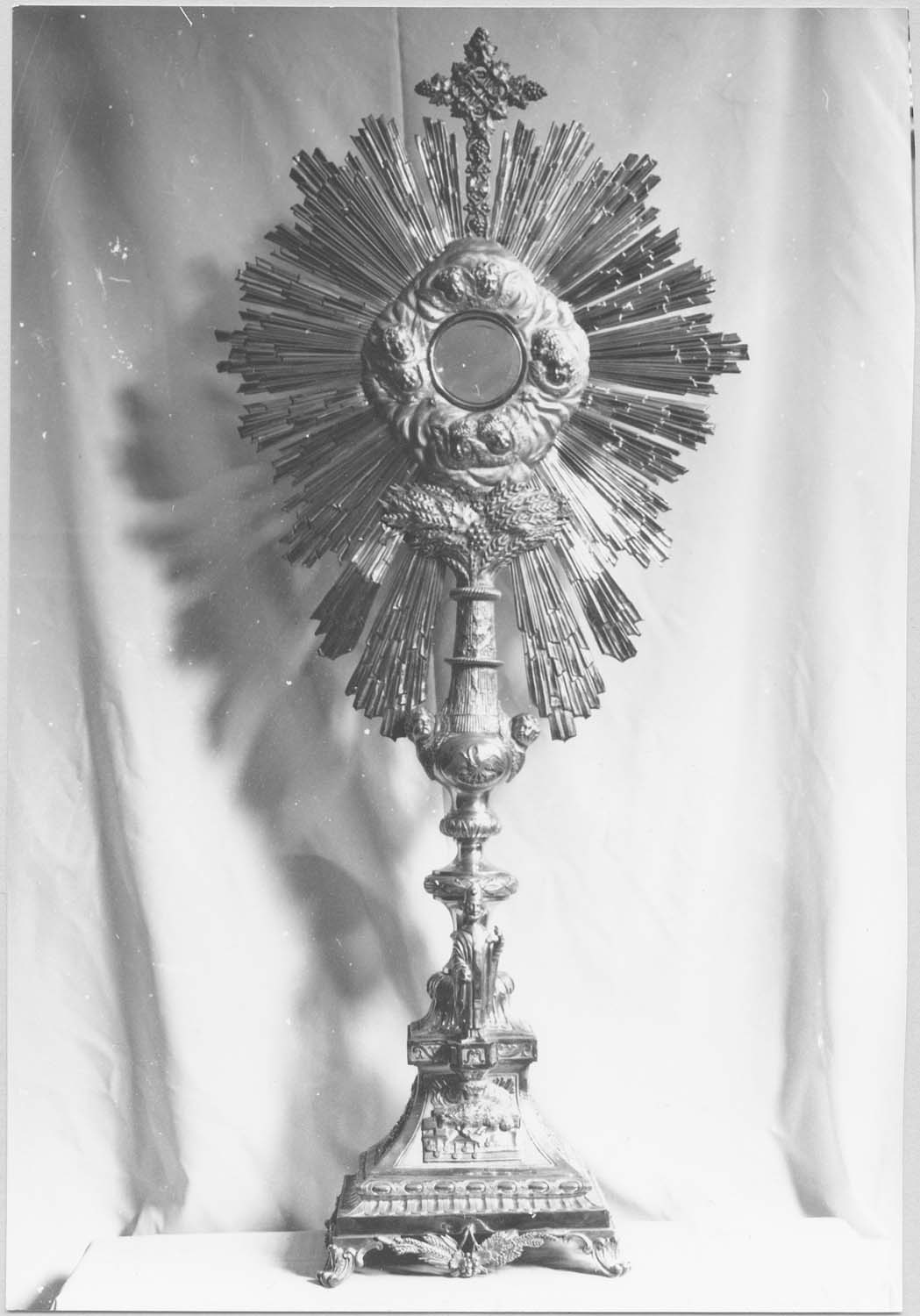La base rectangulaire est posée sur quatre patins végétaux. Le fût est très élancé, à balustre. Cet ostensoir est décoré de trois diamants (il en comportait cinq à l'origine). Au sommet se trouve une croix latine.