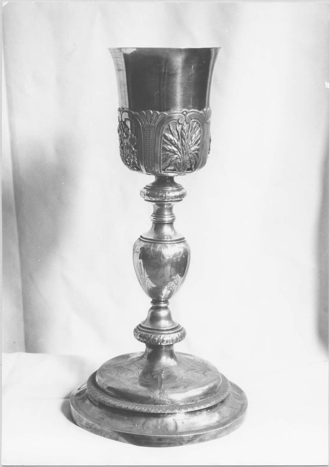 Le pied est rond. Le fût est à balustre, entre deux renflements égaux. La coupe, seule a être dorée, est décorée à mi-hauteur par une fausse coupe.