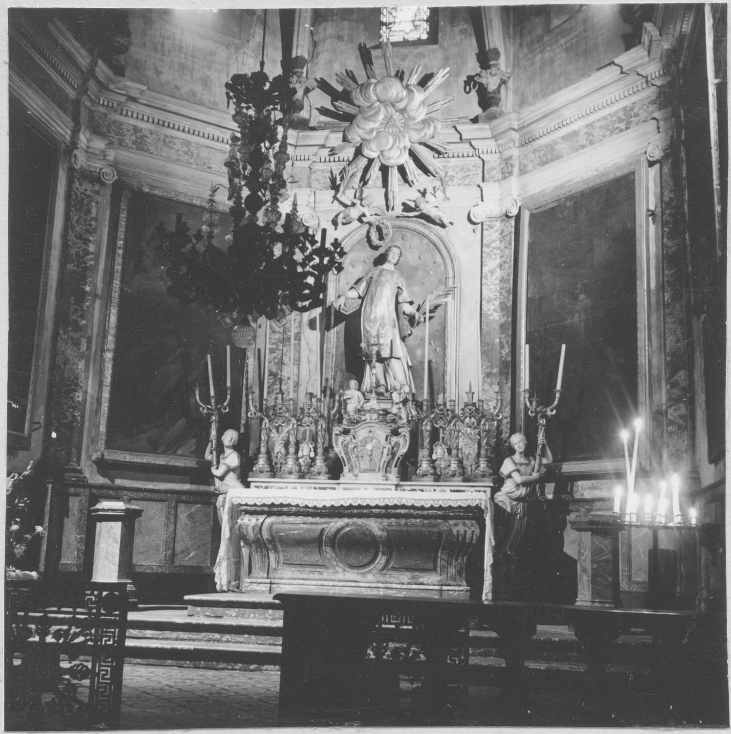 chapelle Saint-Etienne : autel, tabernacle, clôture (table de communion), pilastres, corniche, statue : Saint Etienne, sculpture (gloire), lustre