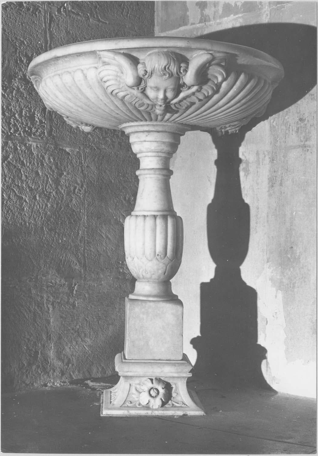 Sur un socle trapézoïdal est posé un dé rectangulaire surmonté d'un balustre. Ce fût supporte une cuve ornée de trois têtes d'angelots ailés, en saillie.