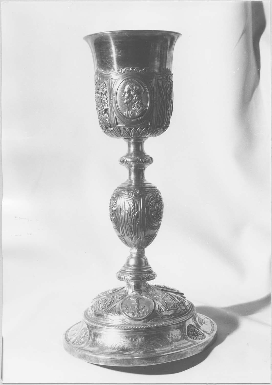 Le pied est rond. Le fût est ovoïde, entre deux renflements. La coupe est décorée d'une fausse coupe ornée.