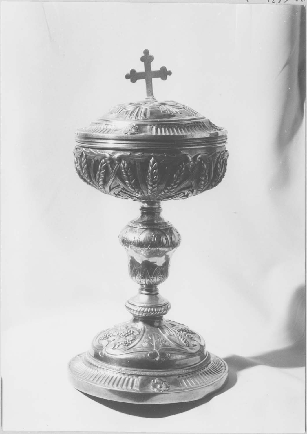Le pied est rond. Le fût est à balustre, posé sur un renflement cordé et supportant la coupe unie décorée d'une fausse coupe. Le couvercle en forme de dôme supporte une croix aux abouts trilobés.