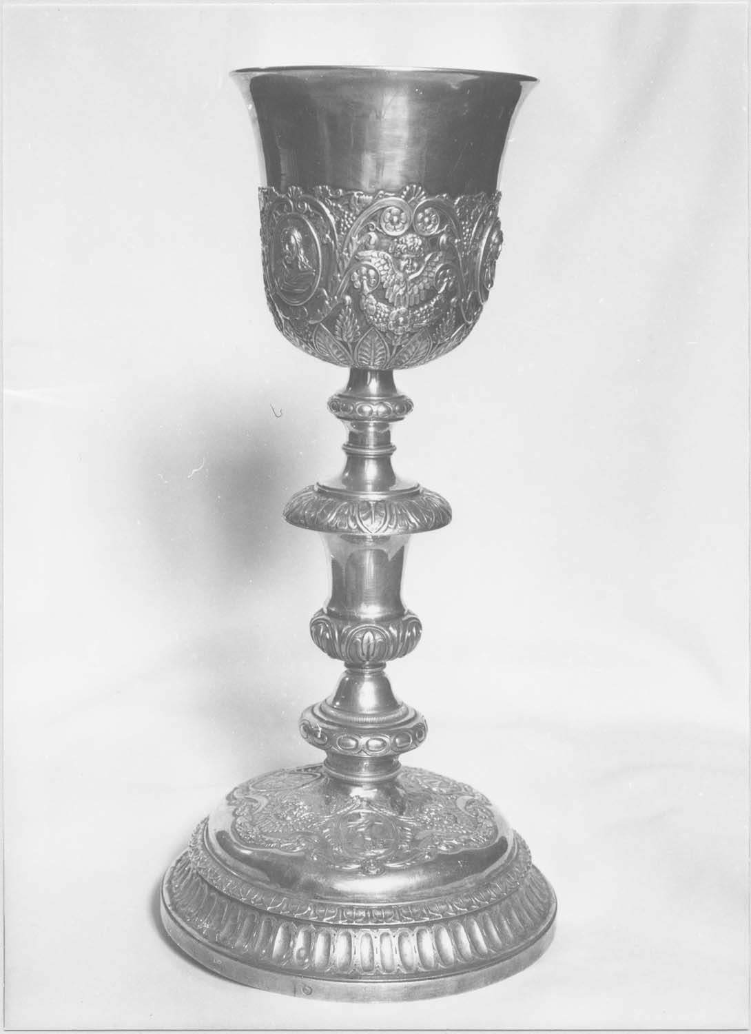 Le pied est rond, à bordure ornée de canaux et rais de coeur, décoré de trois médaillons. Le fût à balustre est décoré d'oves, de lis stylisés et de feuilles descendantes. La fausse coupe est décorée de médaillons.