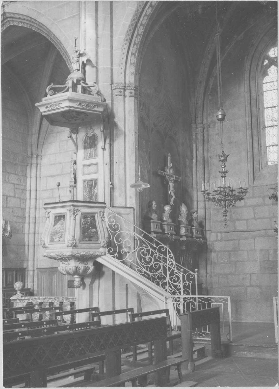 Chaire à prêcher blanche et or, avec des plaques de marbre rouge de Caunes. Elle est surmontée d'un ange sonnant de la trompette au sommet de l'abat-voix. La rampe de l'escalier est en fer forgé.