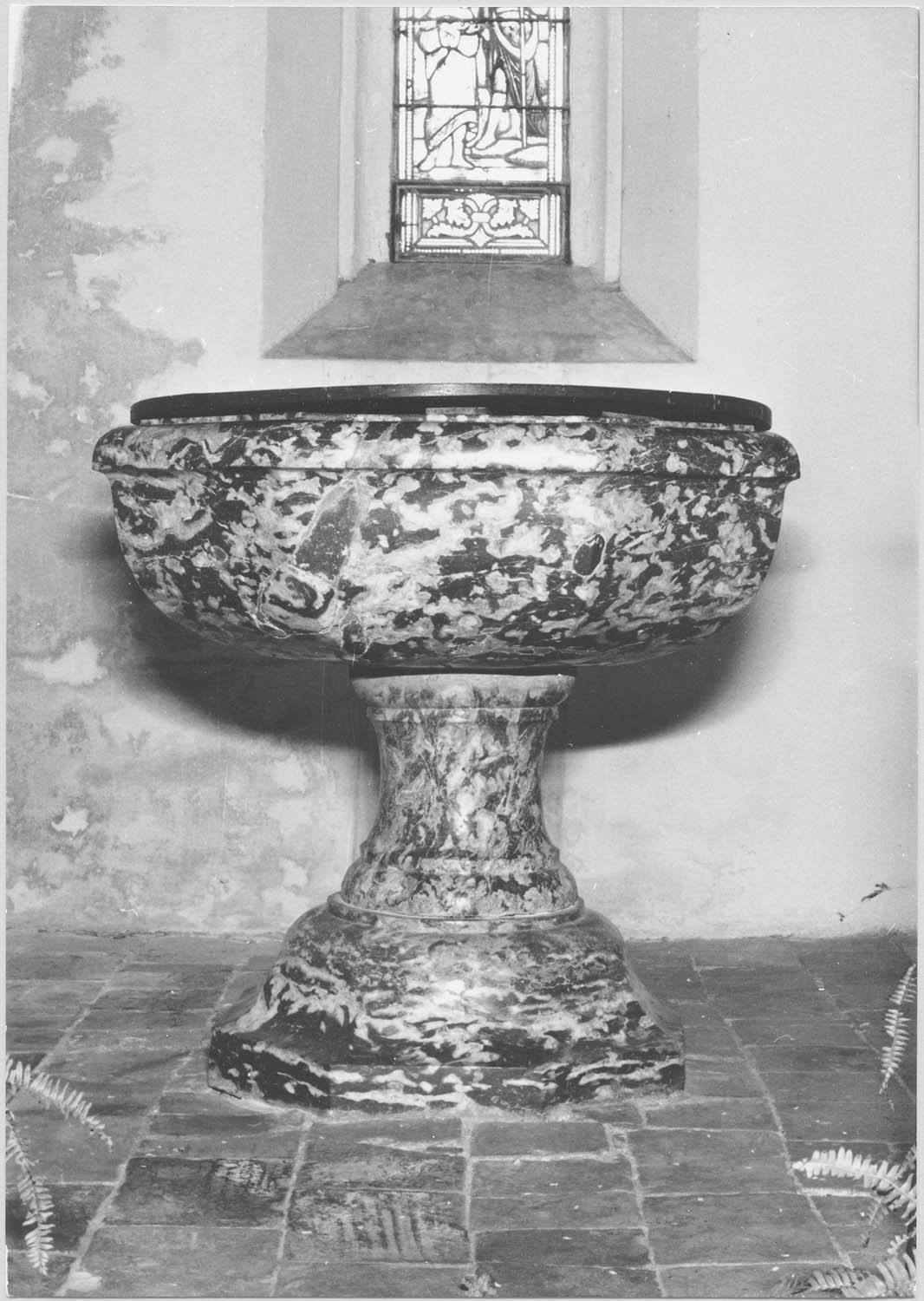 Fonts baptismaux en marbre rose de Caunes. Sur un socle à la base en octogone irrégulier et au sommet ovale, un fût circulaire concave supporte une cuve massive de forme octogonale (octogone irrégulier se transformant en ovale, à l'inverse du socle). L'ouverture de la cuve est ovale.