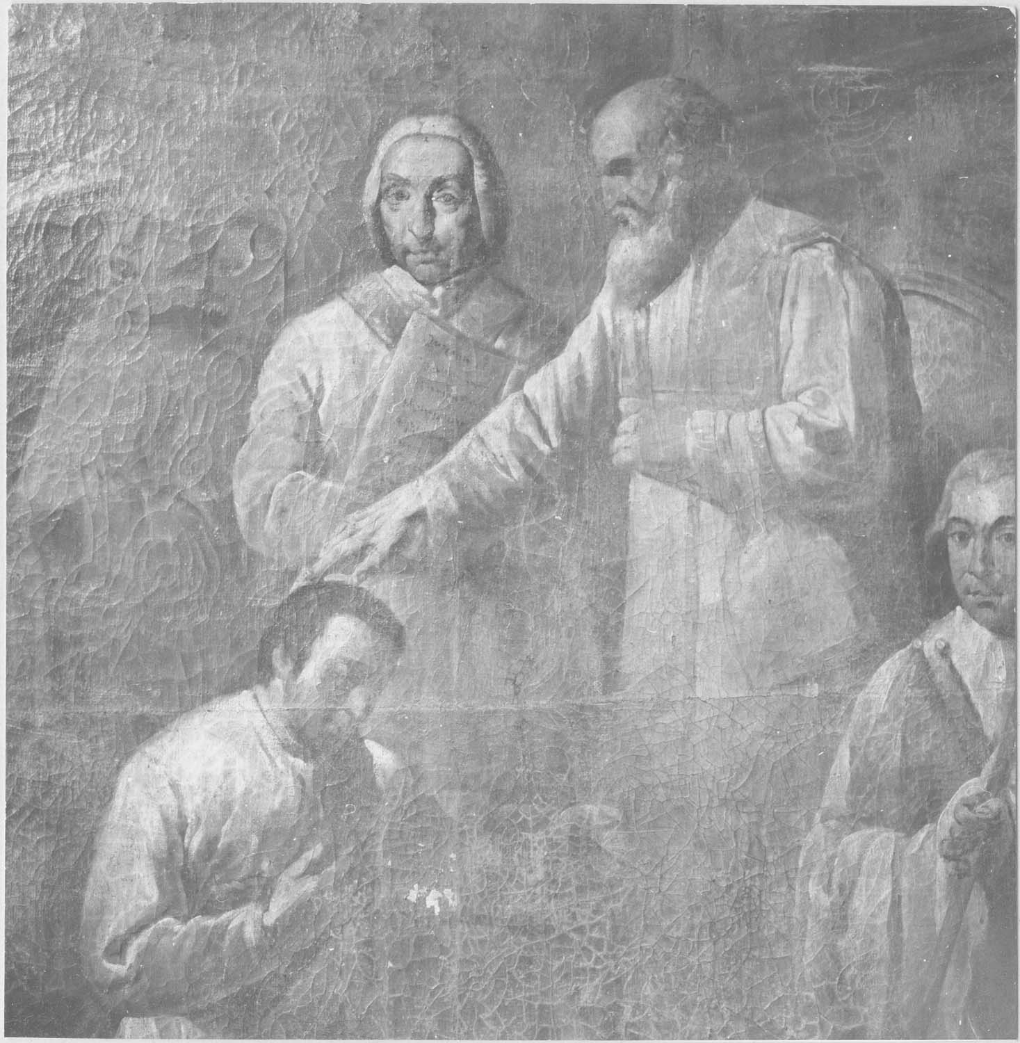 Le peintre Jacques Gamelin est né en 1738 et est mort en 1803. Ces deux toiles avaient été peintes pour décorer le sanctuaire de l'église. Elles furent enlevées et mises au rebut en 1891. Dans l'Ordination, le portrait du prêtre qui se tient à la droite de l'évêque est en fait celui de François-Vincent-Augustin Raucoule, curé de Saint-Vincent de 1740 à 1790. Les deux acolytes au premier plan ont vraissemblablement les traits des vicaires de l'époque