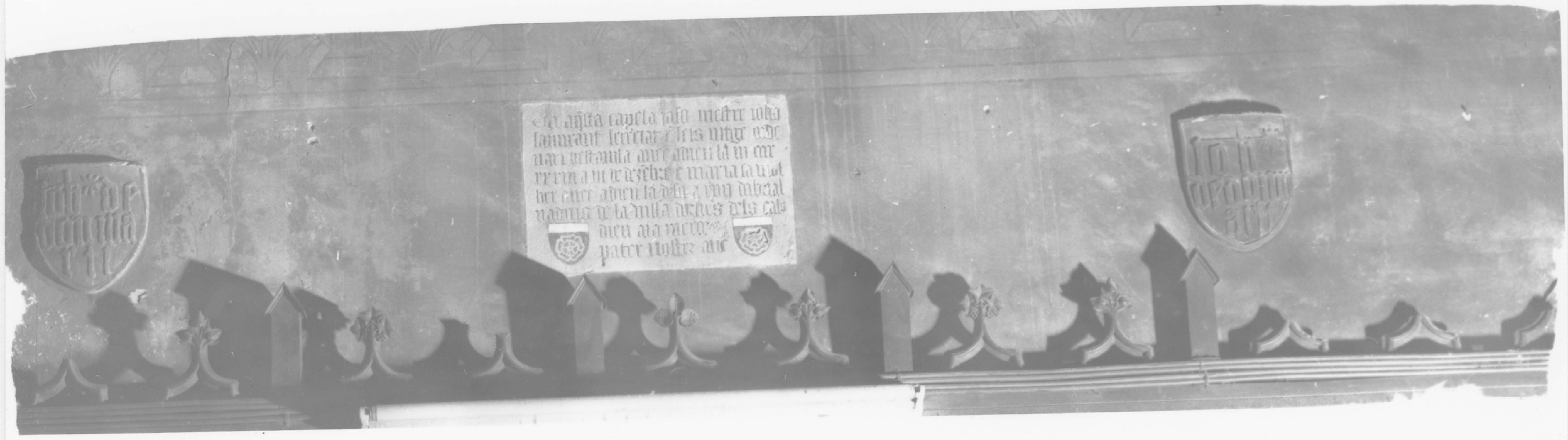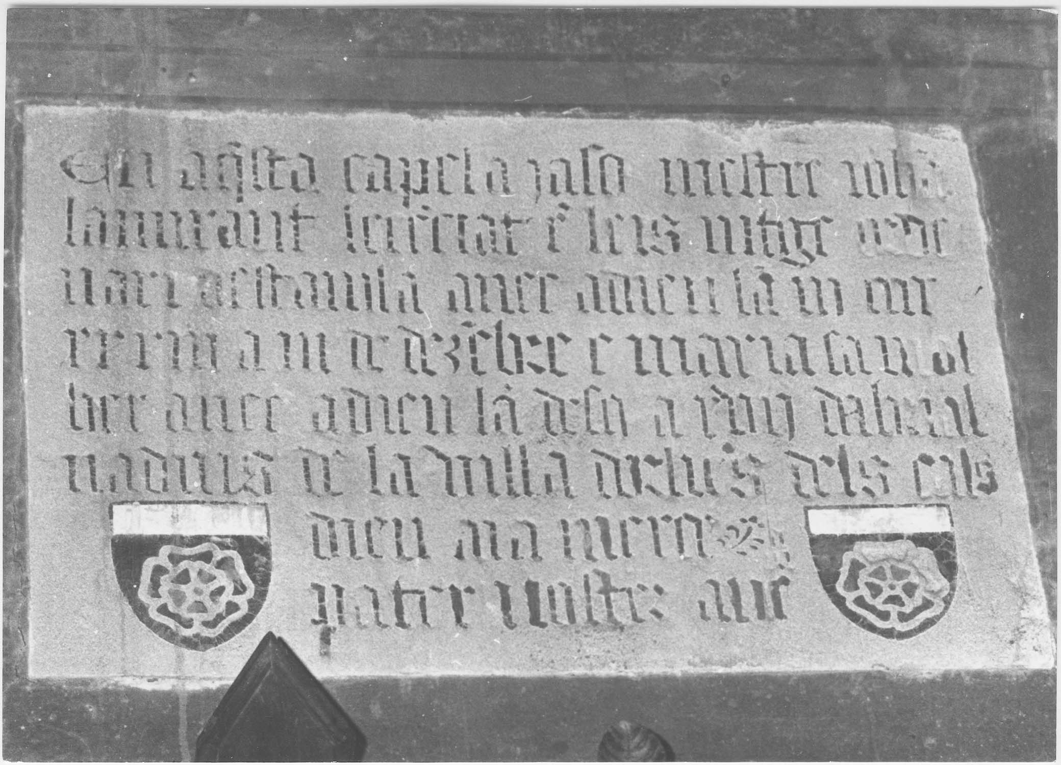 Inscription (gravée, occitan) : EN AQ (e) STA CAPELA JASO (n) MESTREIOHA (n) LAMIRANT [?]L (e) CE (n) CIAT E (n) LEIS JUTGE ORDINARI DESTA VILA ANEC A DIEU LA (n) M (il) CCCC XXXIII A (l) M (es) D (e) DEZE (m) BRE E MARIA SA MOL LIER ANEC A DIEU L4AN DESO A (l) XVII DABRIAL NADVIS DE LA VILLA DARLUS [?] DELS CALS DIEU AIA MERCE PATER NOSTER. AVE. (huit lignes). Armoiries : écu avec l'inscription en bas-relief : IO DE DOMINA RTI (à gauche) et : IO DE DOMI ACTI (à droite).
