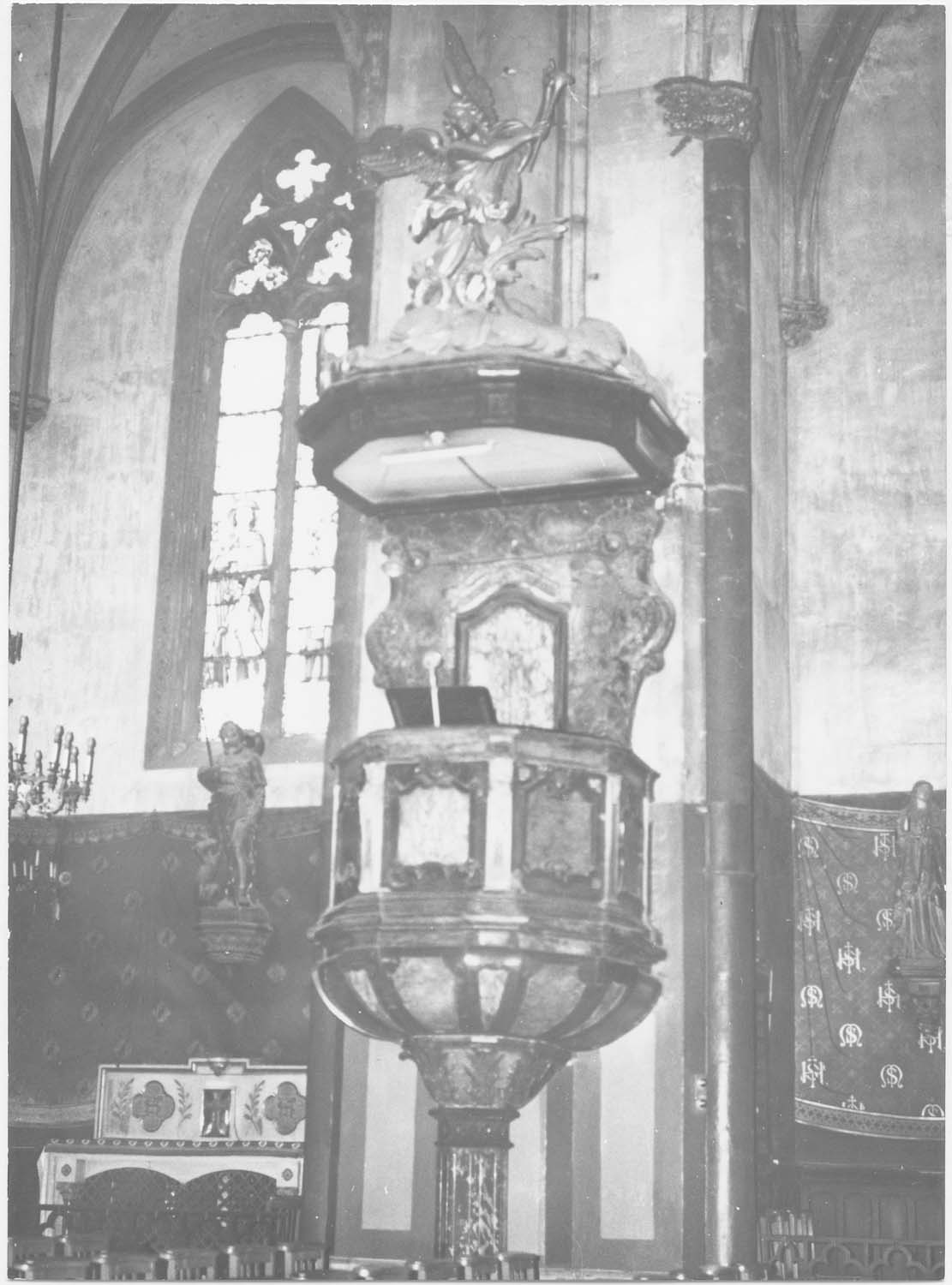 Cette chaire à prêcher est en marbres de diverses couleurs, en partie marqueté, et en bois doré. Au dessus de l'abat voix, sur une nuée, une grand ange tient une trompette.