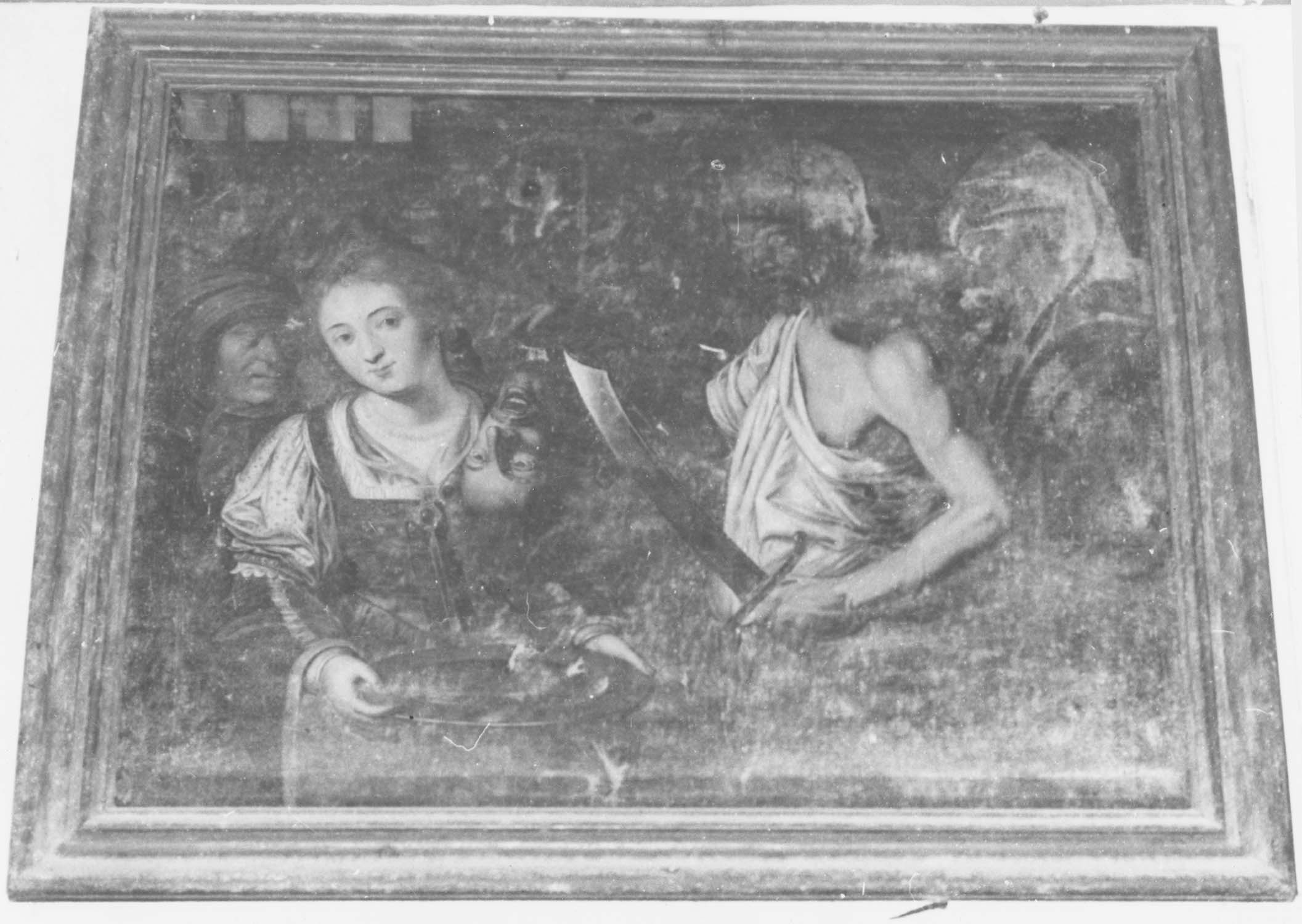 Le bourreau présente à Salomé la tête de Jean-Baptiste qu'il vient de décapiter avec le cimetère qu'il tient encore dans sa main gauche. Salomé, à gauche de la toile, tend un plat qu'elle tient de ses deux mains. Derrière elle se tient une servante. On aperçoit en haut à gauche les barreaux d'une fenêtre de la prison de saint Jean-Baptiste.