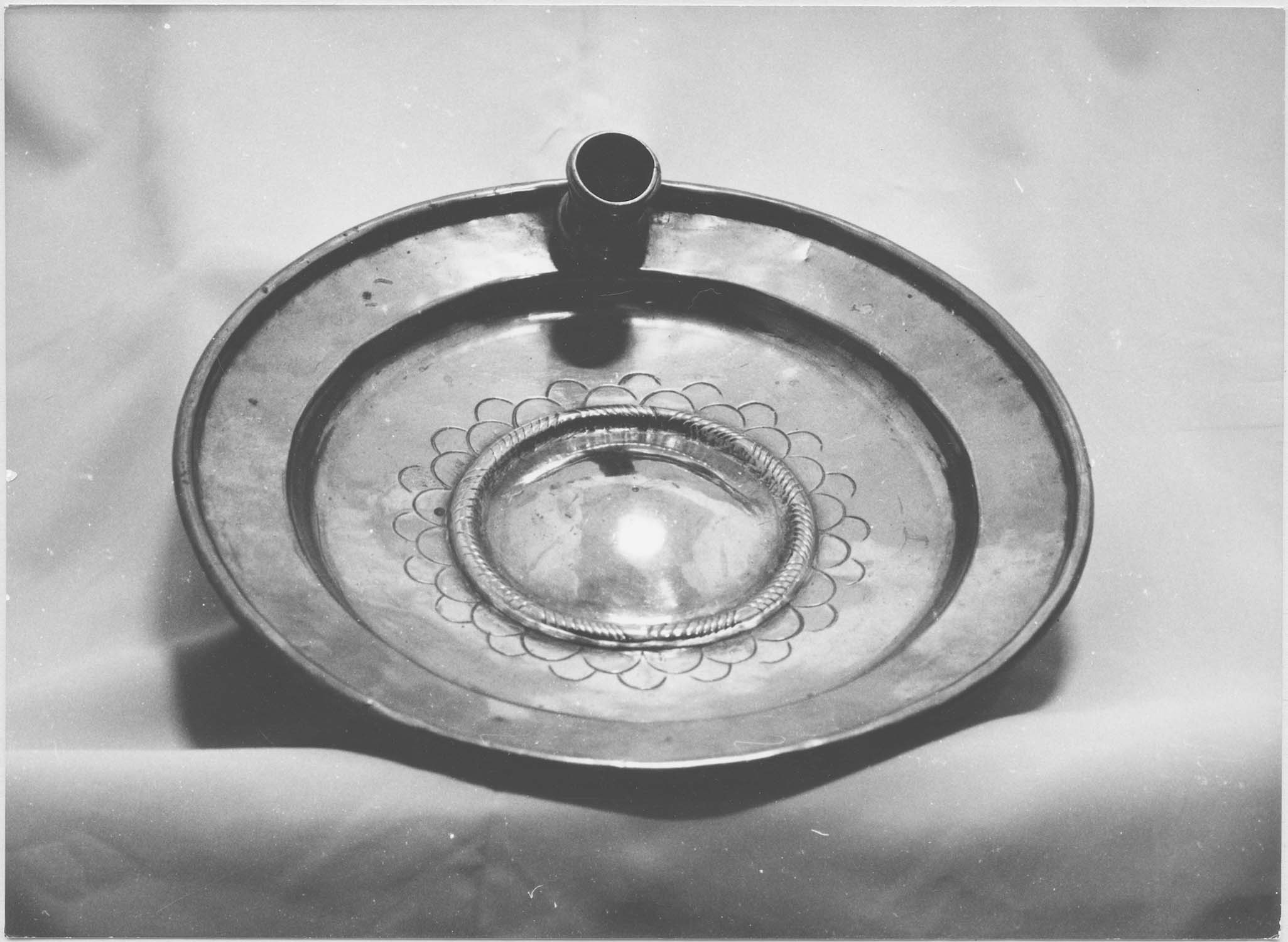 Ce plat présente un logement en son centre, pour accueillir une statuette. Un porte-bougie est fixé sur le côté.