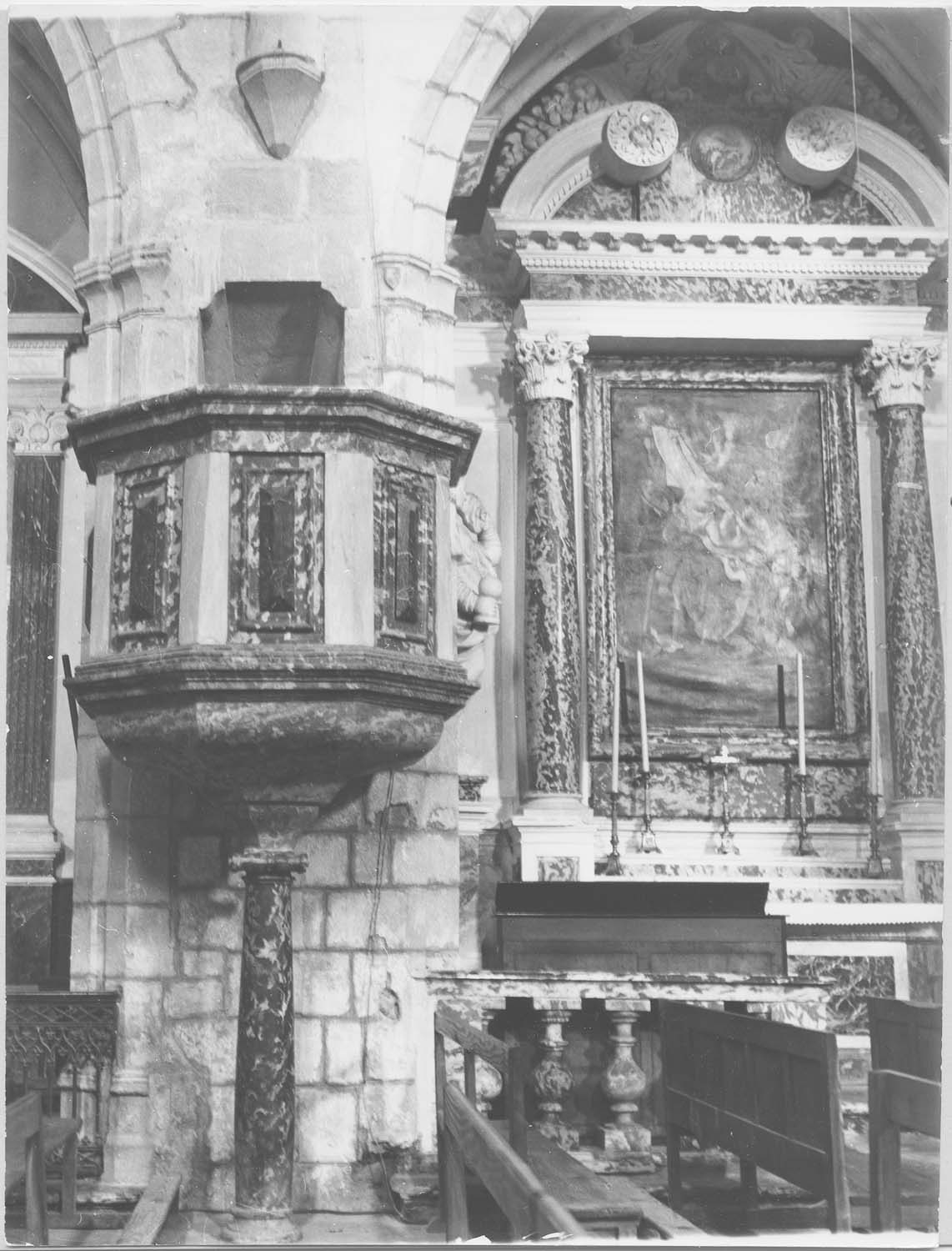 Cette chaire à prêcher est en marbres de diverses couleurs, de Caunes-Minervois. La cuve est de forme heptagonale, posée sur une colonne de marbre rouge à chapiteau ionique.