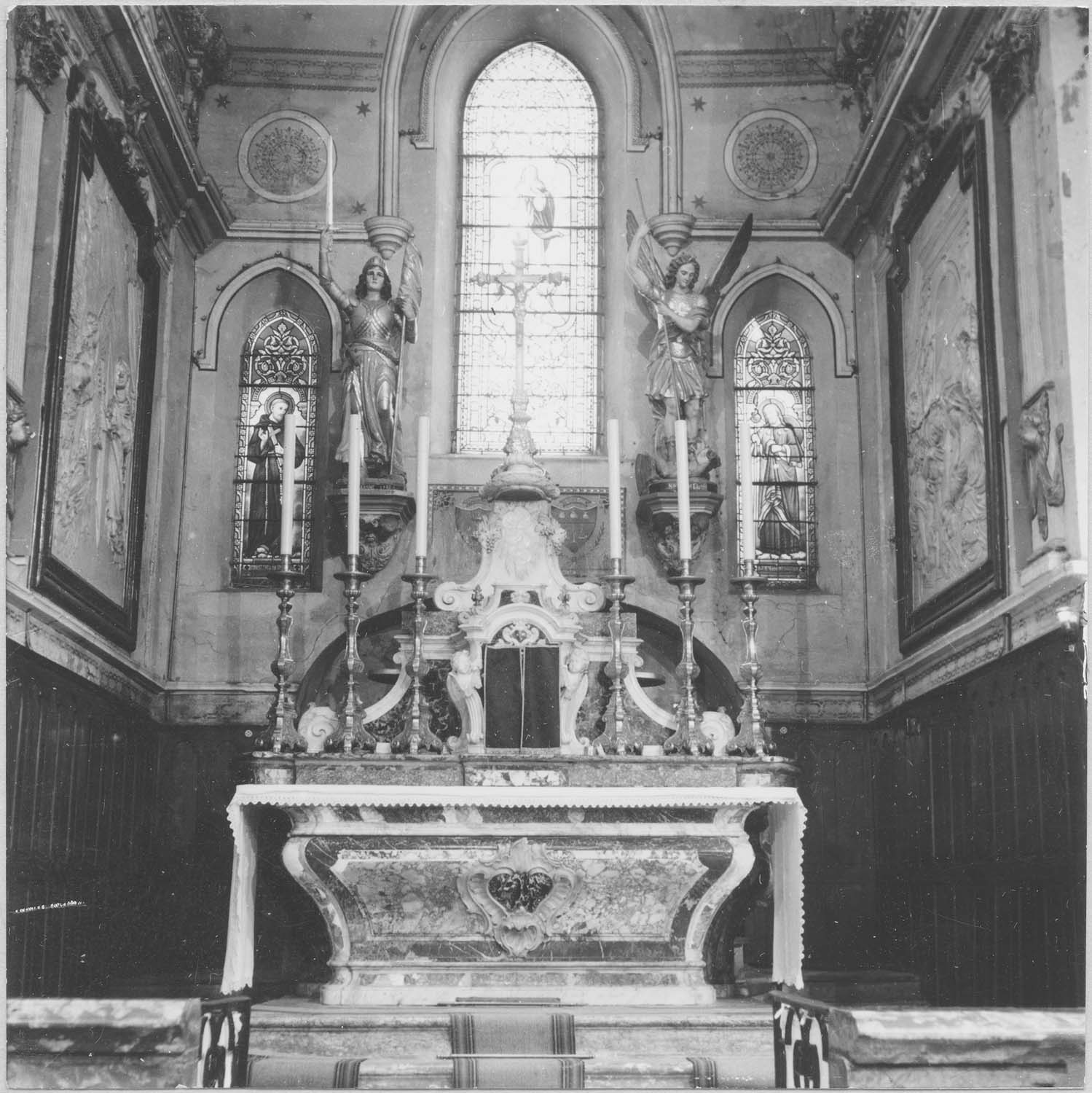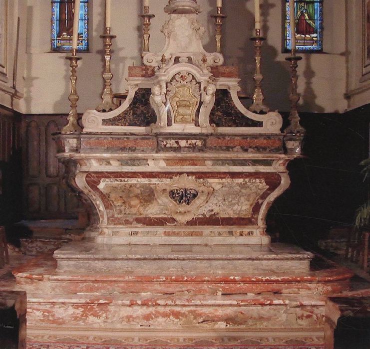 Ce maître-autel, de style Louis XV, est fait de marbres de diverses couleurs.