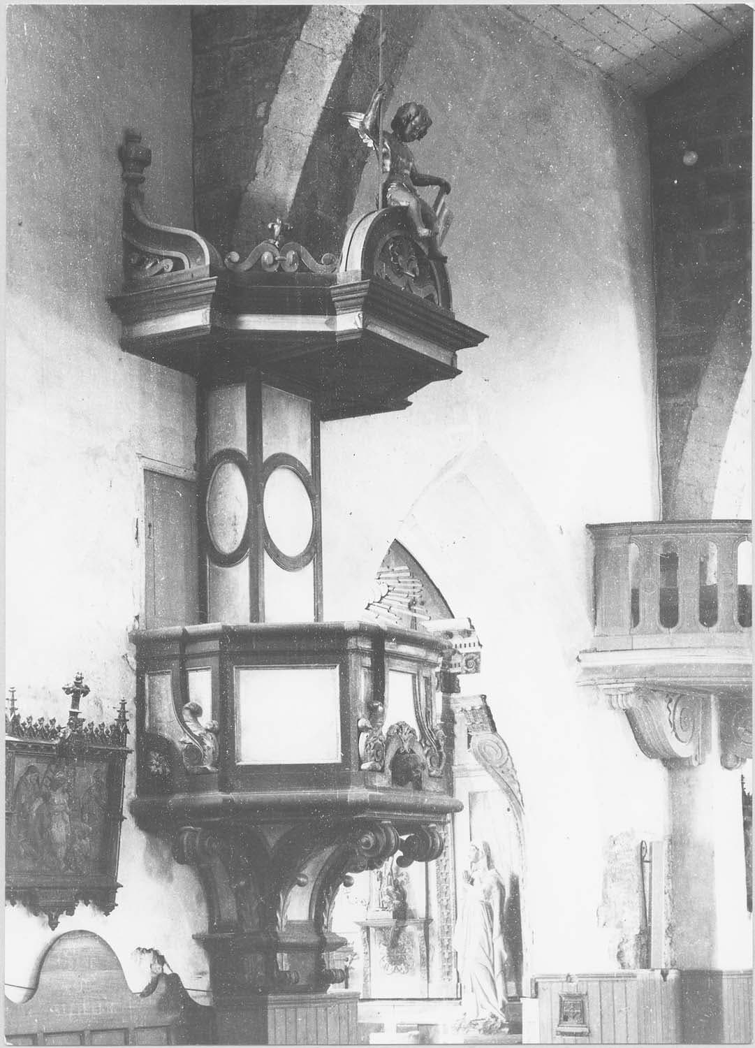 La cuve, de section trapézoïdale, est posée sur une console décorée. Elle est constituée de plaques de marbre blanc encadrées de bois sculpté, peint et doré. Le dorsal épouse la forme du pilier de l'arc diaphragme sur lequel la chaire est accrochée. L'abat-voix, en corniche, est surmonté d'un angelot assis.