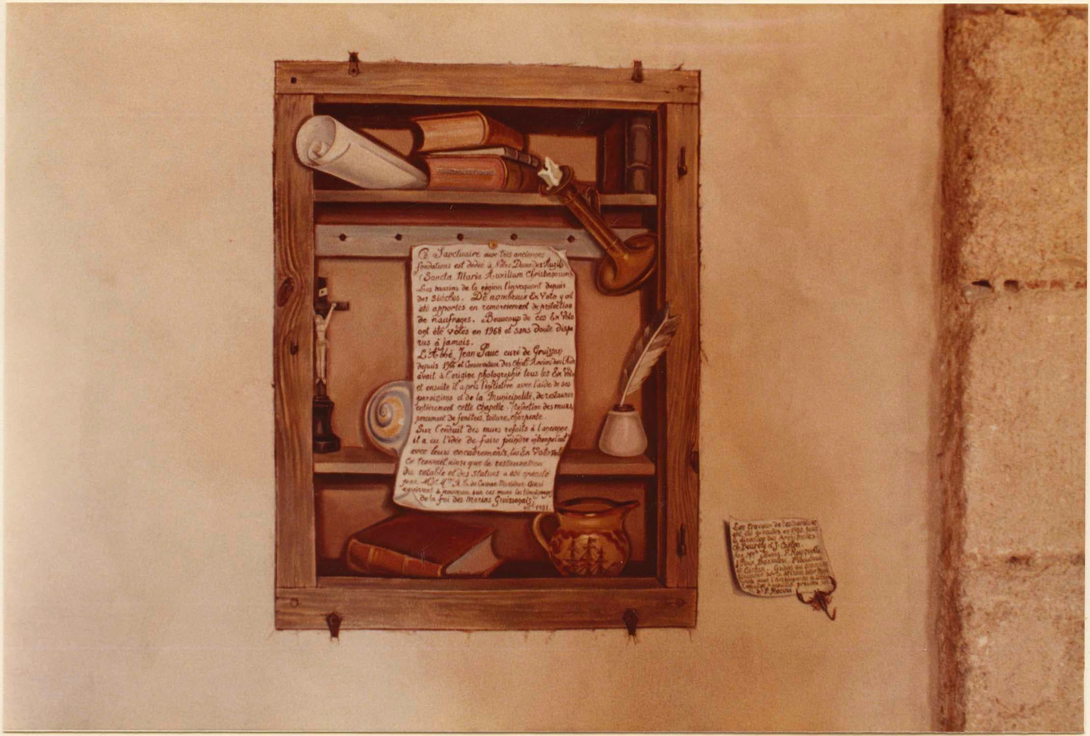 Les ex-voto sont peints en trompe-l'oeil directement sur le mur car à la fin des années 60 une cinquantaine d'ex-voto ont été volés dans la chapelle. Grâce à des vieilles photos, elles ont été reproduites directement sur le mur.