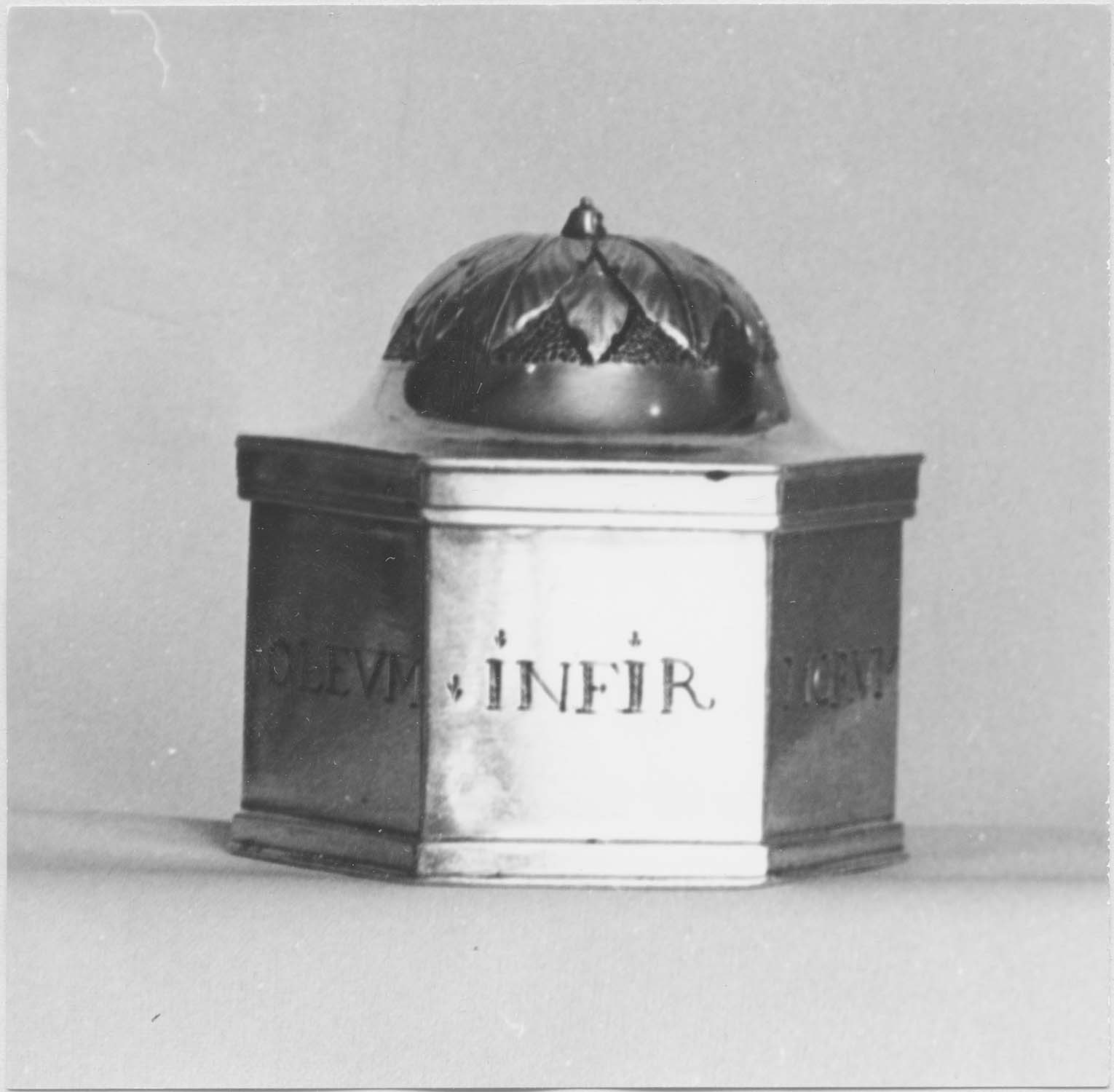 Inscription (gravée, latin) : OLEVM INFIRMORVM. Poinçon de maître (initiales) : lettres VF fleurdelisées (trois fois répété sur la base).