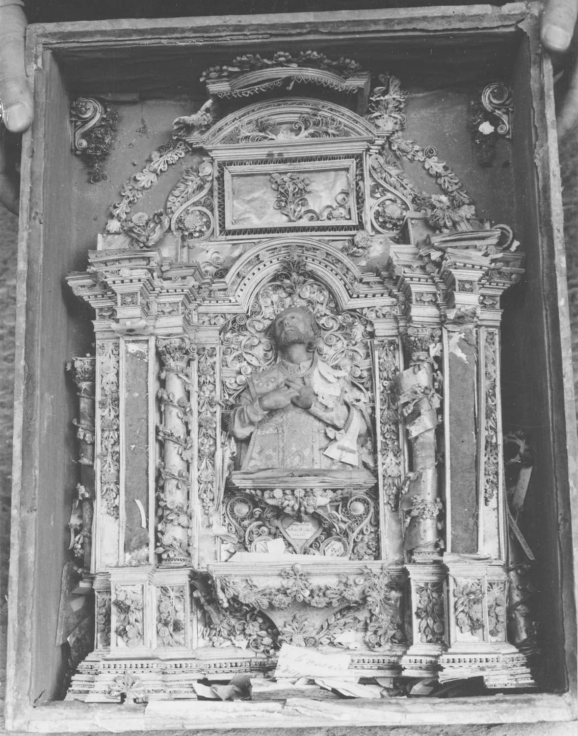Ce reliquaire est composé d'un autel et de son retable en réduction. Au dessus de l'autel se trouve le buste de saint Philippe Neri, revêtu des ornements sacerdotaux. Quatre colonnes reposant sur un stylobate et soutenant une corniche à fronton et baldaquin entourent l'image du saint. Le matériau employé est constitué de papier, en cahier, découpé et recouvert de feuilles métalliques, ornées de tortillons. Le visage et les mains du saint sont en cire. L'ensemble est contenu dans une boîte fermée par une vitre.