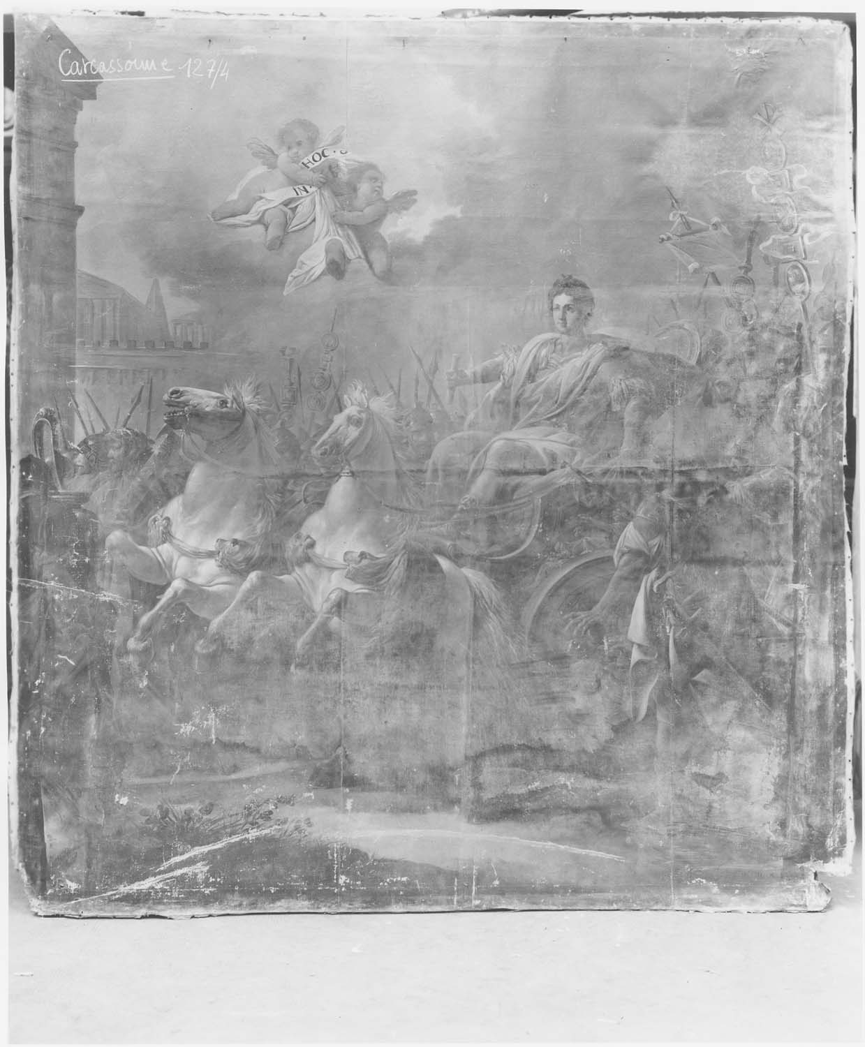 Le peintre Jacques Gamelin est né en 1738 et est mort en 1803. Cette toile provient de la Chambre de Commerce de Carcassonne. Elle a été exposée à Carcassonne en 1898 et en 1938. Sur le catalogue de l'Exposition de 1898, elle était intitulée à tort Entrée d'Alexandre le Grand à Babylone, et, dans un livre d'Henri David datant de 1928 (consacré au peintre Jacques Gamelin), Entrée de César à Rome.