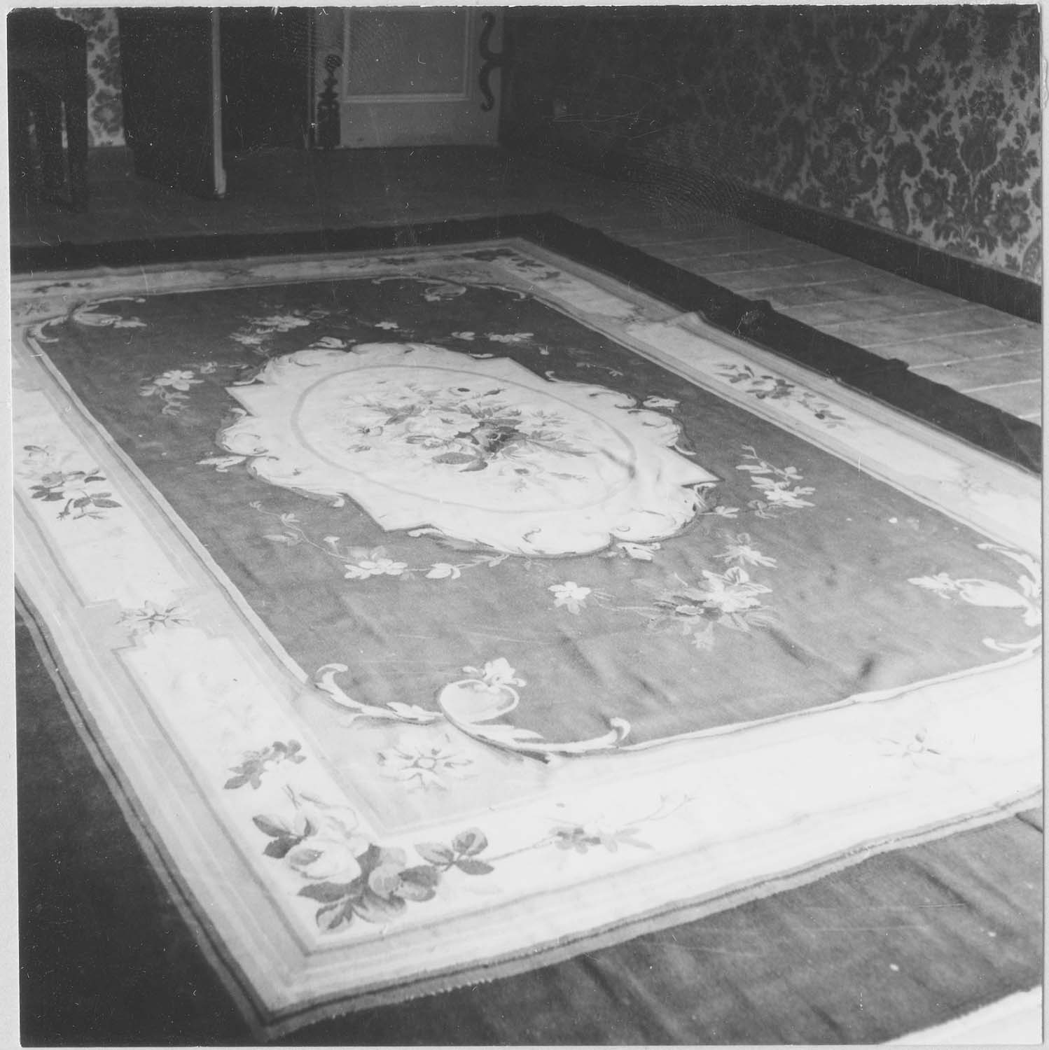 Le tapis le plus grand présente un bordure noire. Au centre, se trouve un bouquet de roses et de dahlias. Certaines fleurs sont violettes et rouge brique. Les rubans sont bleus. Les fleurs sont représentées sur un fond crème. Autour, des torsades vertes, orange, vert foncé. Le tapis le plus petit présente au centre un médaillon de roses avec leur feuillage et quelques fleurs bleues, sur fond clair. La bordure extérieure est rouge foncé, suivie d'une bande verte, puis crème, ornée de bouquets de roses. Le bouquet central est entouré d'un espace rouge sur lequel sont jetées des roses.