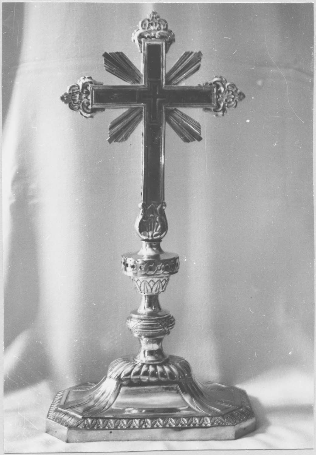 Fonctions combinées. Cette croix-reliquaire pédiculée présente un pied octogonal. La relique est à l'intersection des branches de la croix.