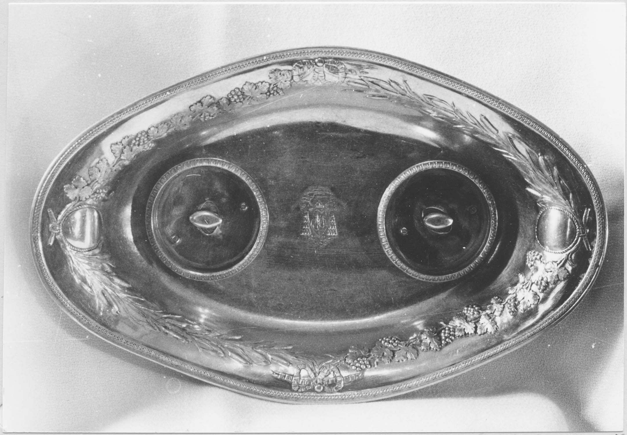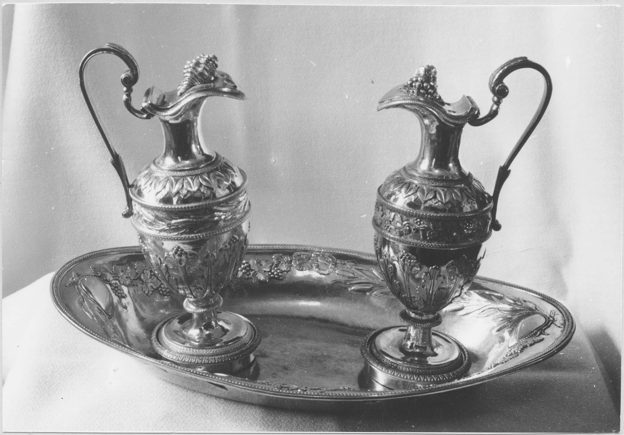 Ensemble en vermeil. Le plateau présente un bassin ovale, légèrement élargi au milieu, avec une fine bordure à dessin géométrique. Deux dispositifs ronds sont prévus pour maintenir les burettes. Ils sont fixés au plateau et peuvent en être détachés.