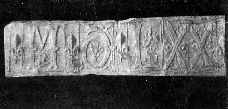Inscription (latin) : IHS MA XPS vincit XPS regnat XPS imperat XPS ab omni malo nos custodiat [?]. Ste Nazare ora pro nobis (en caractères gothiques, les mots étant séparés par des fleurs de lys). Date : MVc LXX (2e ligne).